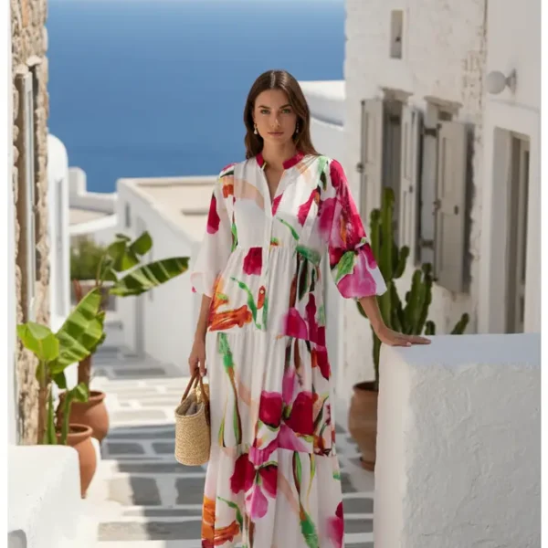 Ρομαντικό maxi φόρεμα από 100% βισκόζη με λευκή βάση και έντονο φούξια floral print. Αέρινο, δροσερό και θηλυκό, ιδανικό για κάθε στιγμή της ημέρας.