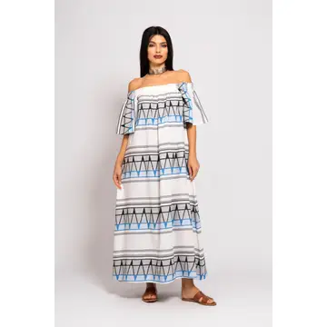 Υφαντό φόρεμα από 100% βαμβακερό jacquard με ανάγλυφη υφή και έμπνευση από την αρχαία ελληνική αισθητική. Φυσικό, δροσερό και διαχρονικά κομψό.