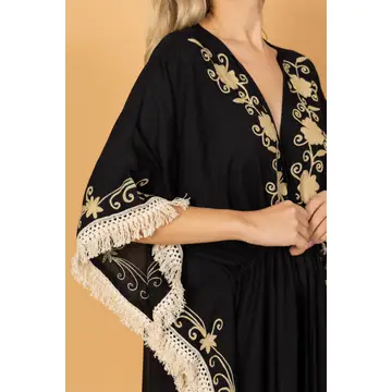 Μαύρο Κιμονό με Κέντημα & Κρόσσια από 100% Βαμβάκι – Boho Statement One Size