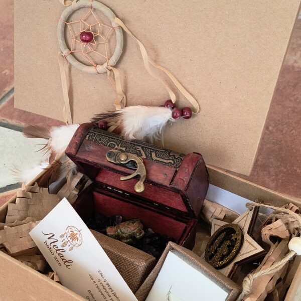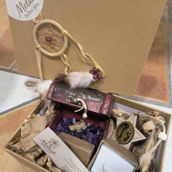 Ένα premium boho κιτ γεμάτο συμβολισμό: χελώνα από ουνακίτη μέσα σε ξύλινο σεντούκι με αμέθυστο, ασημένιο βραχιόλι Flower Bloom, χριστουγεννιάτικο ξύλινο στολίδι και ονειροπαγίδα. Ένα δώρο γεμάτο προστασία, φωτεινότητα και αγάπη.