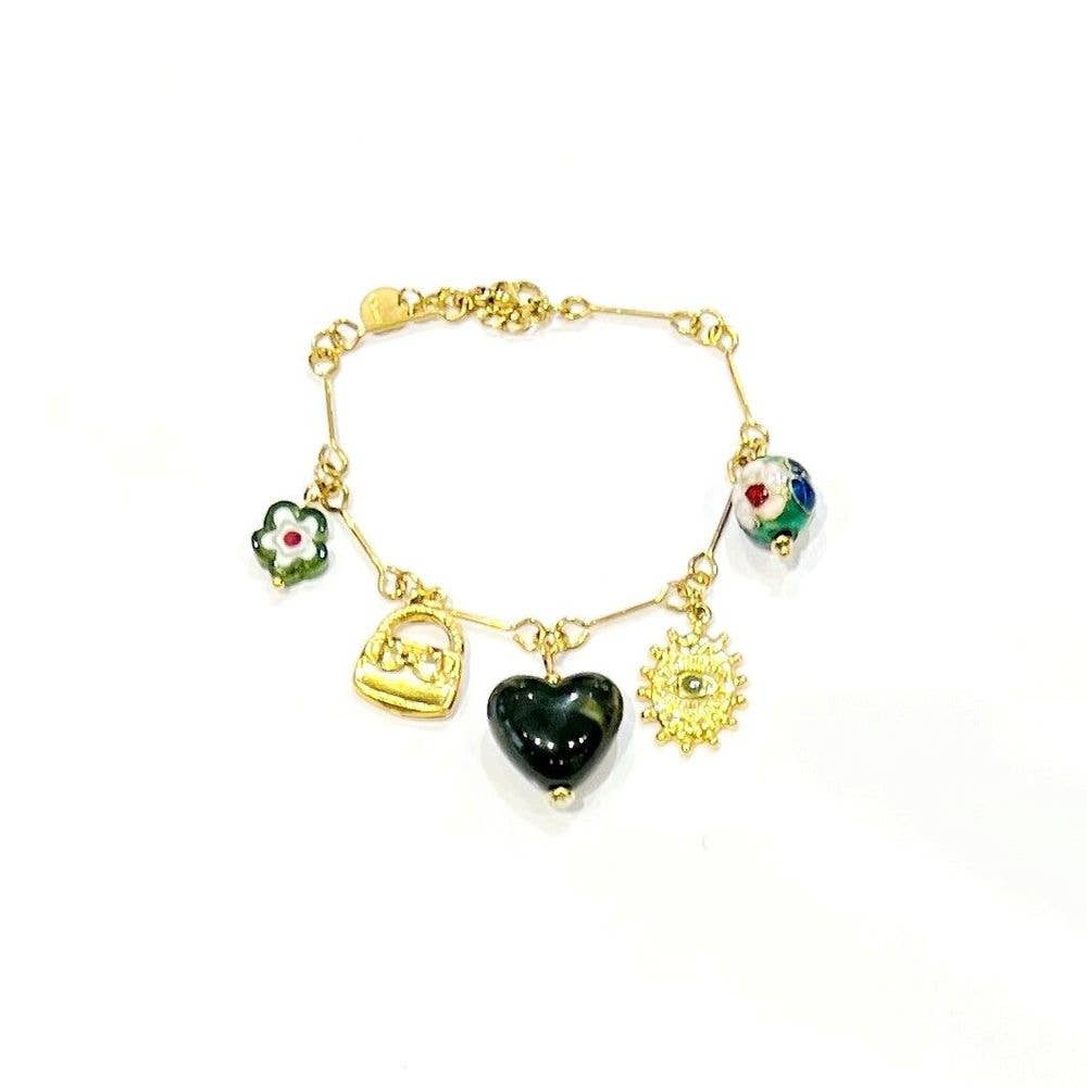 Χειροποίητο βραχιόλι 7bis, σχεδιασμένο και κατασκευασμένο στο Παρίσι. Διαθέτει επιμήκη χρυσή αλυσίδα και ιδιαίτερα γούρια, με κεντρικό στοιχείο καρδιά από ρητίνη. Κατασκευασμένο από πιστοποιημένο ανοξείδωτο ατσάλι 316L, υποαλλεργικό και ανθεκτικό στη φθορά του χρόνου.