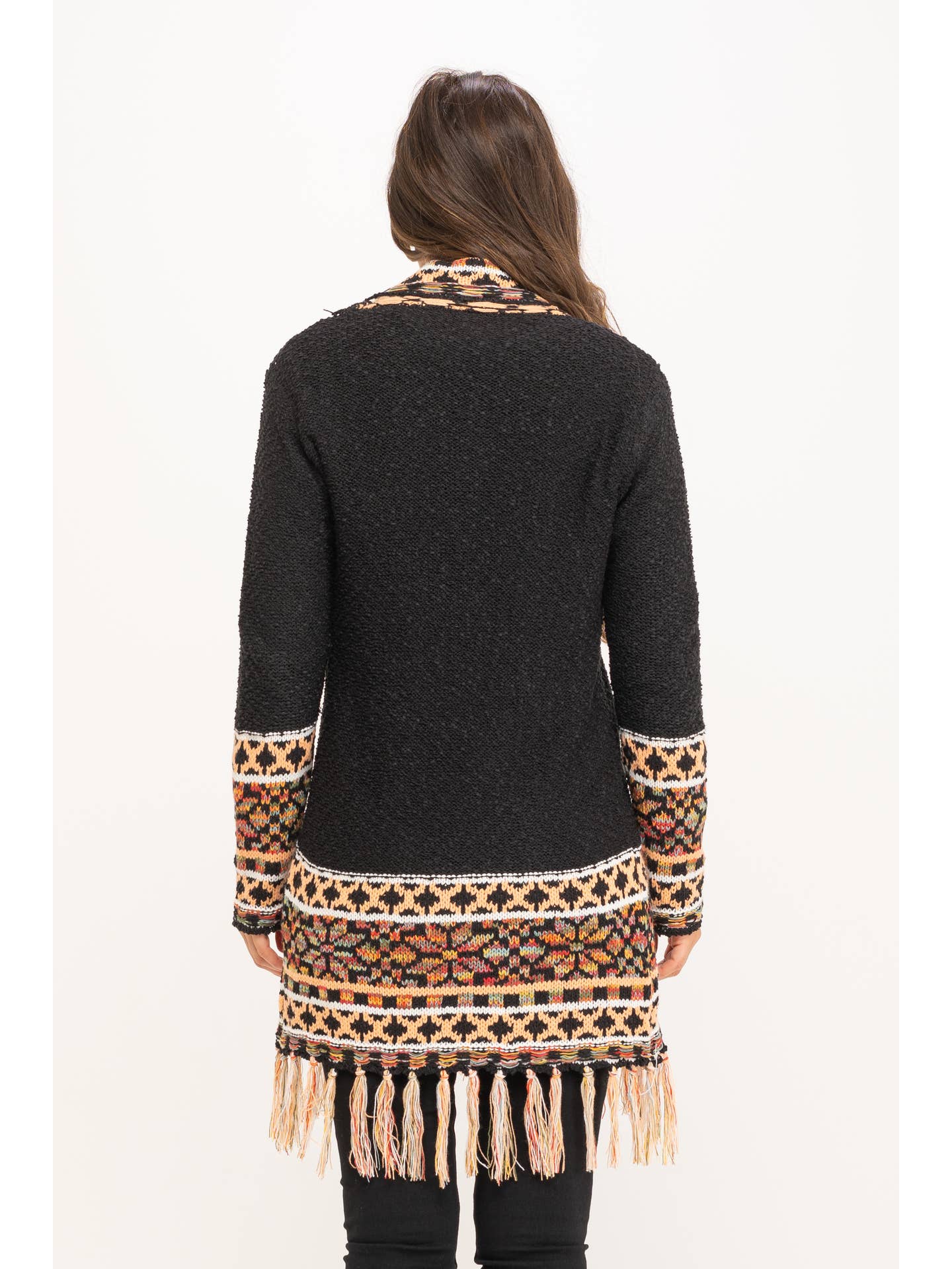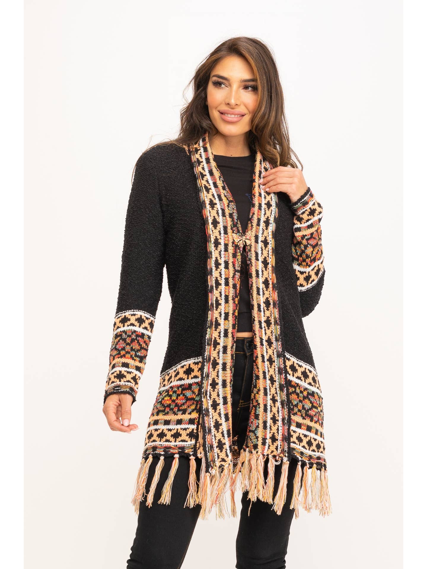 Μακρια το πλεκτή ζακέτα jacquard με κρόσσια στο τελείωμα και απαλό άγγιγμα. Ιδανικό για layering σε boho & cozy εμφανίσεις.