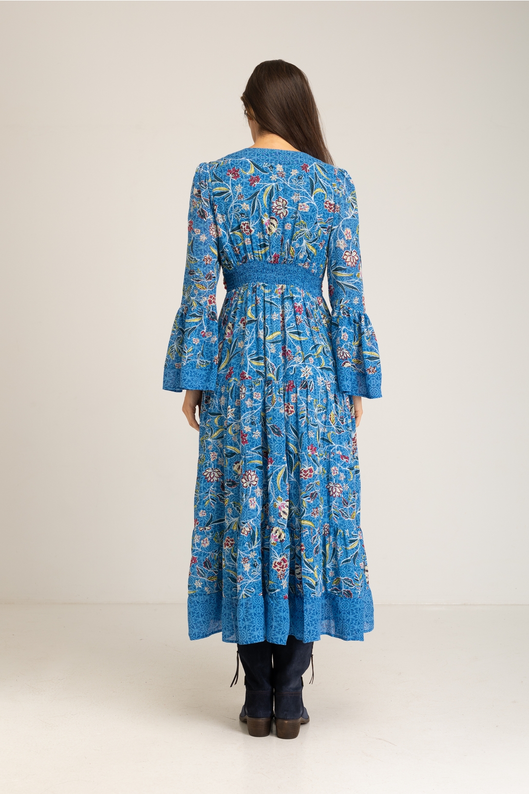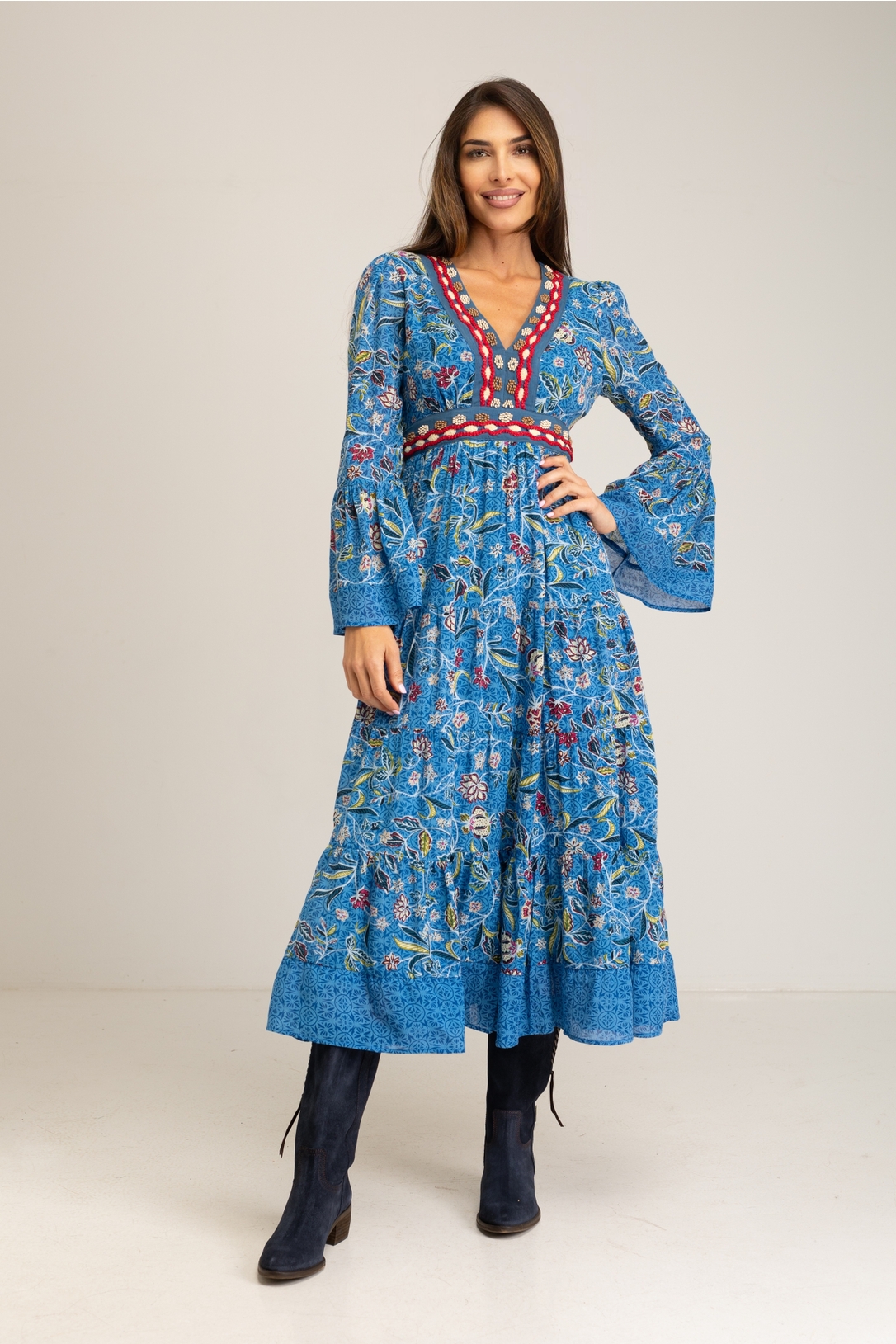 Μακρύ φόρεμα με εντυπωσιακό σχέδιο, V-λαιμόκοψη και κεντήματα στο λαιμό και τη μέση. Τα μανίκια τελειώνουν με κομψά βολάν, ενώ η σύνθεση από 100% βισκόζη crepe και φόδρα 100% βαμβάκι προσφέρει άνεση και κίνηση. Προέρχεται από τη συλλογή Peace and Love της Μαδρίτης, Ισπανία, γνωστή για την υψηλή ποιότητα και το boho στυλ της. Ιδανικό για ένα κομψό και ρομαντικό look, στο ύφος του Meladi.