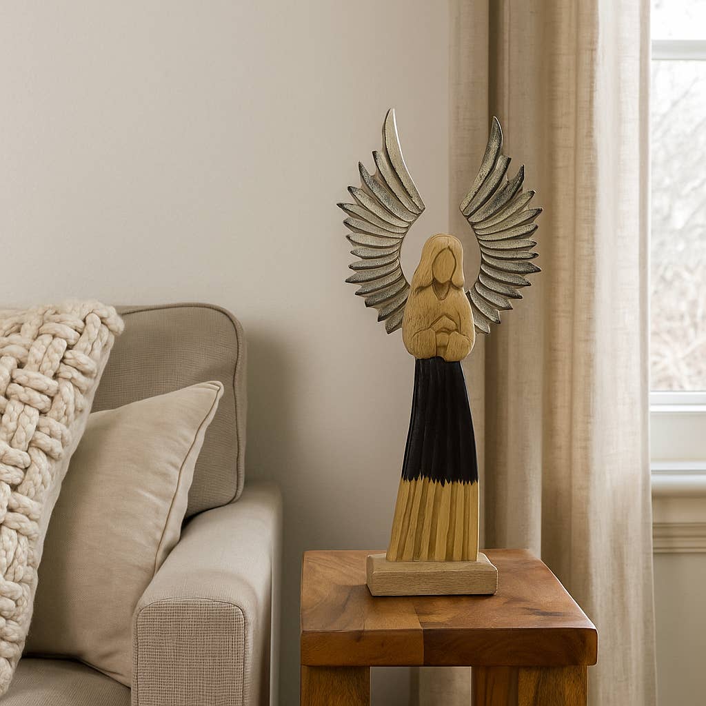 Ένας εντυπωσιακός Φύλακας Άγγελος ύψους 40 εκ., που αποπνέει προστασία, δύναμη και γαλήνη. Χειροποίητος, σκαλισμένος στην Ινδία από βιώσιμο ξύλο μάνγκο, συνδυάζει τη ζεστασιά του φυσικού ξύλου με πλούσια μεταλλικά φτερά και κομψές λεπτομέρειες από σμάλτο.