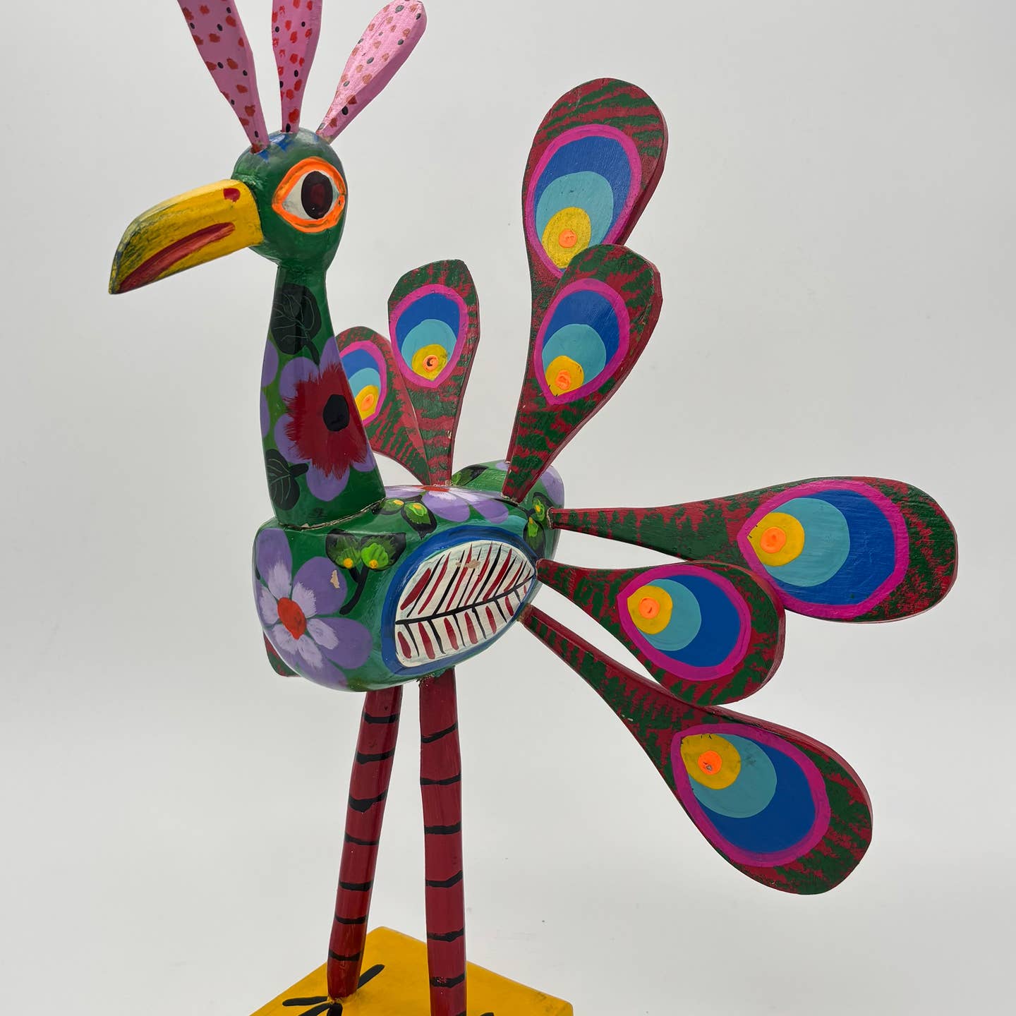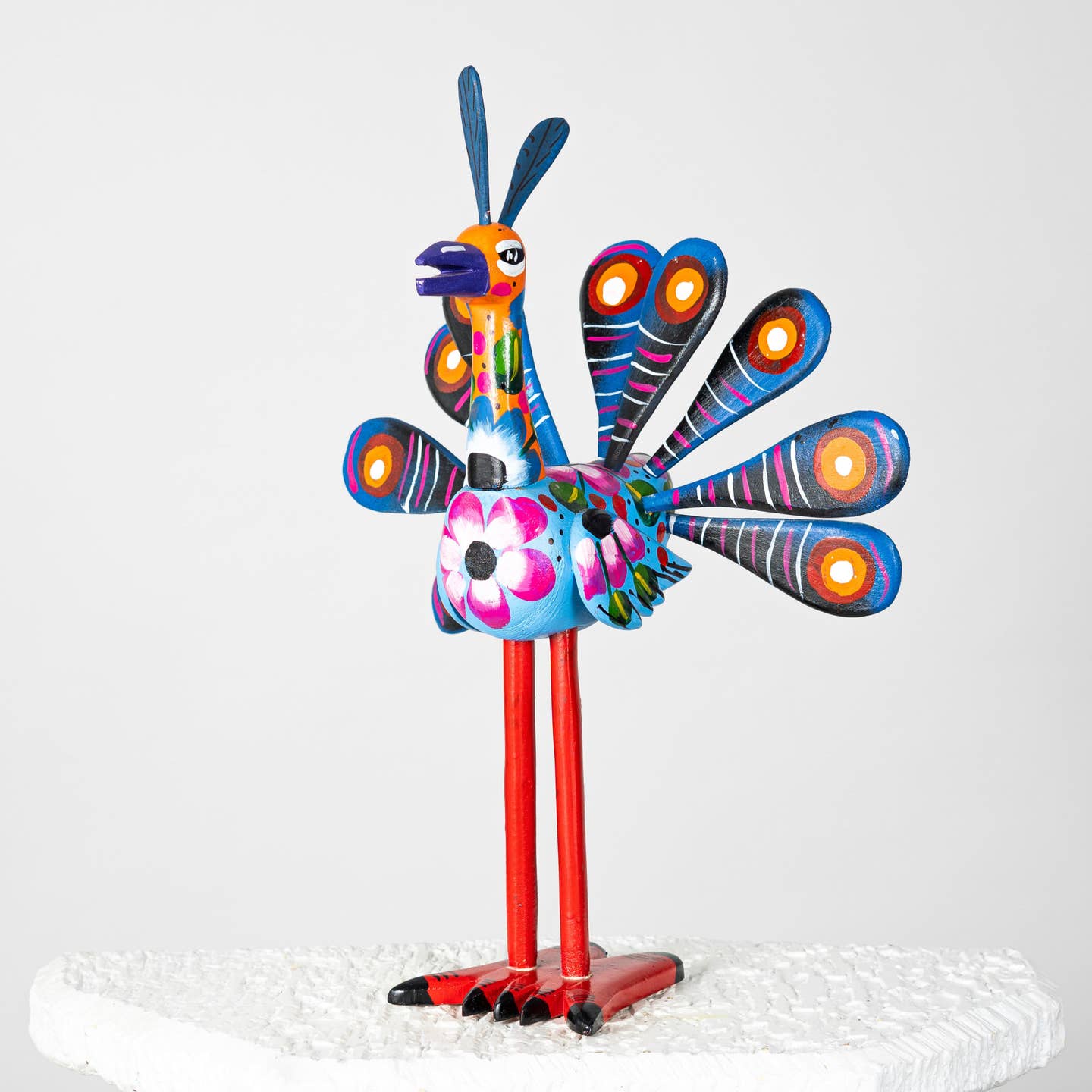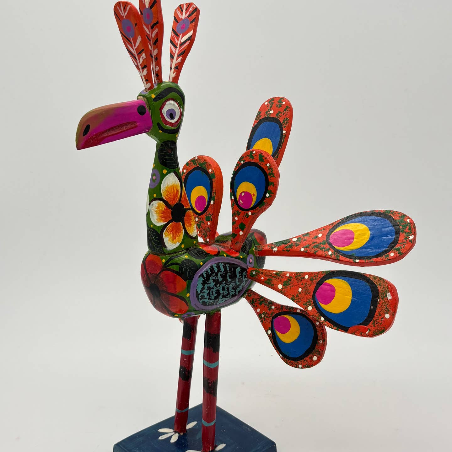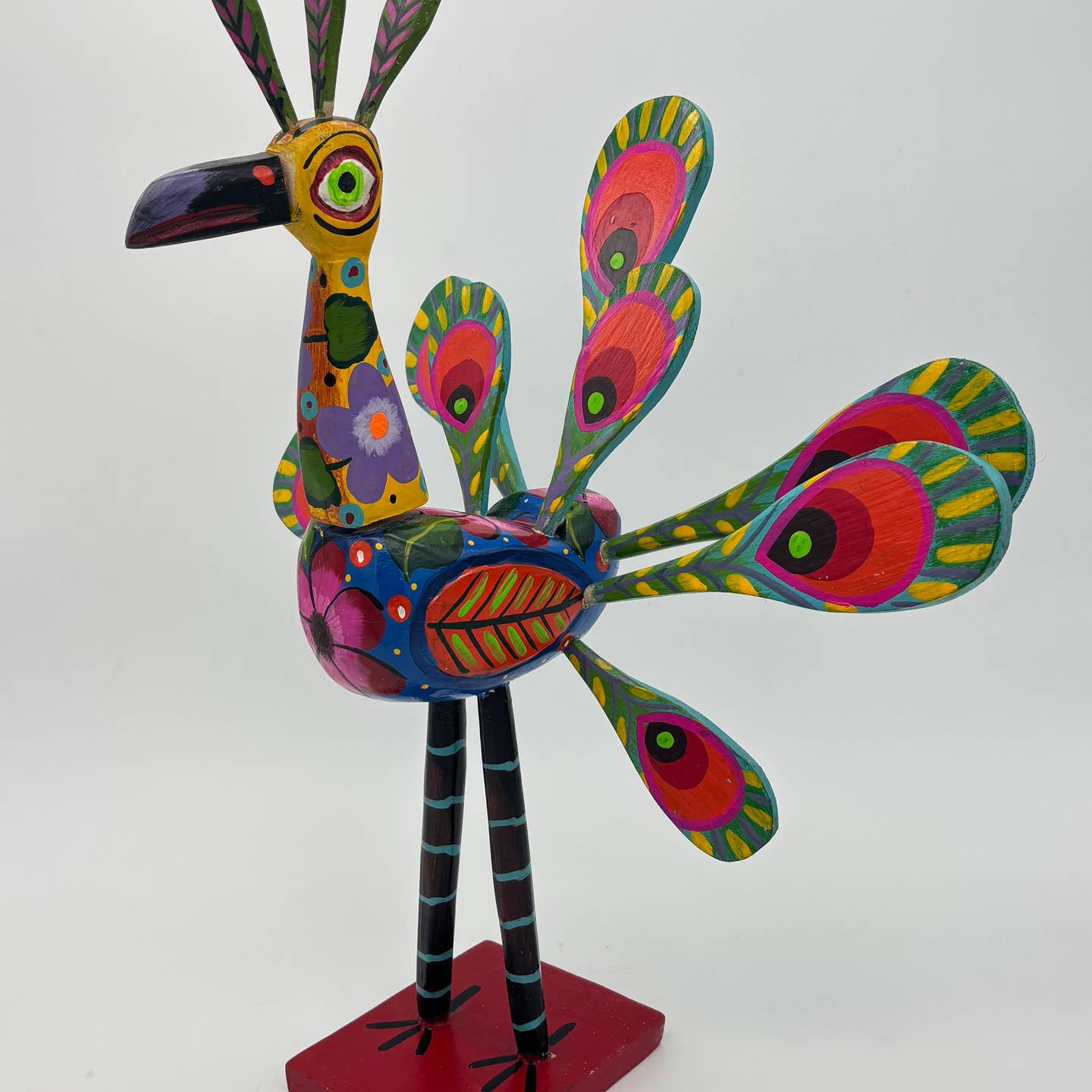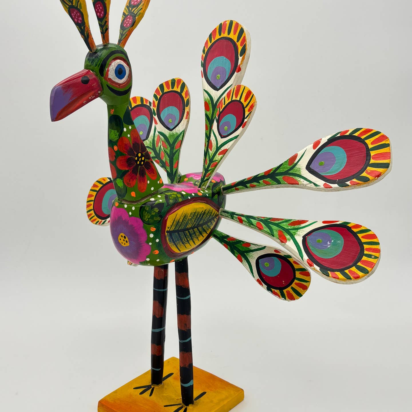 Χειροποίητο παγώνι Nahual από ξύλο με φυσικά χρώματα και σμάλτο, σύμβολο κομψότητας και πνευματικής σοφίας. Boho διακόσμηση και συλλεκτικό έργο από Γουατεμάλα.
