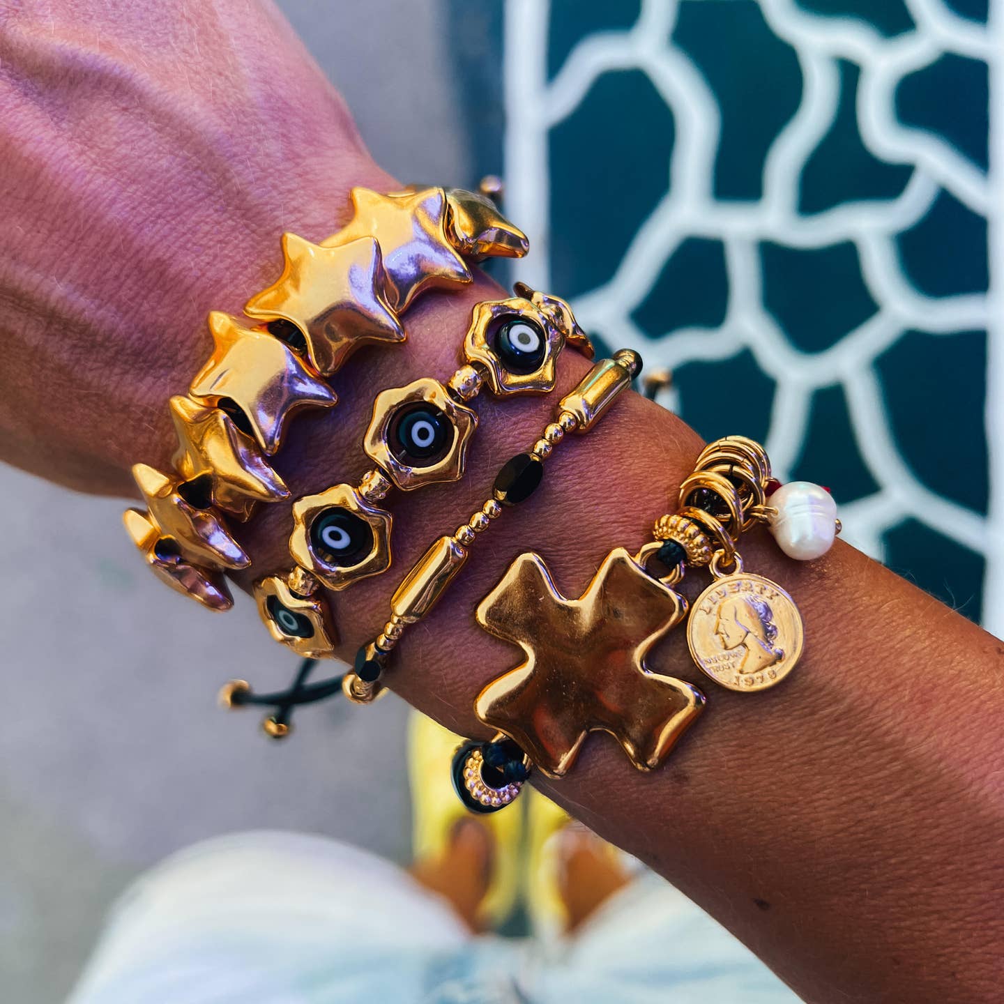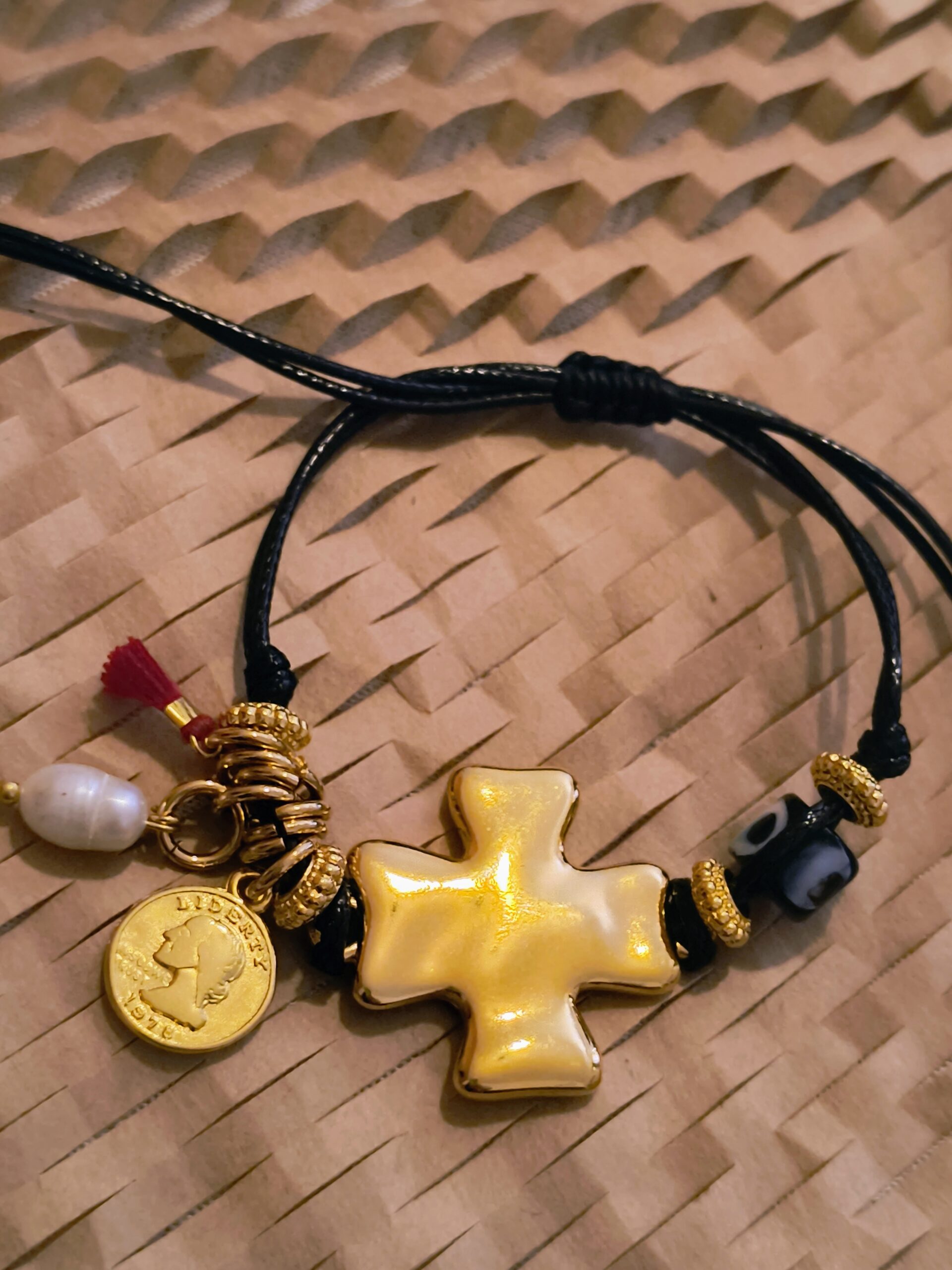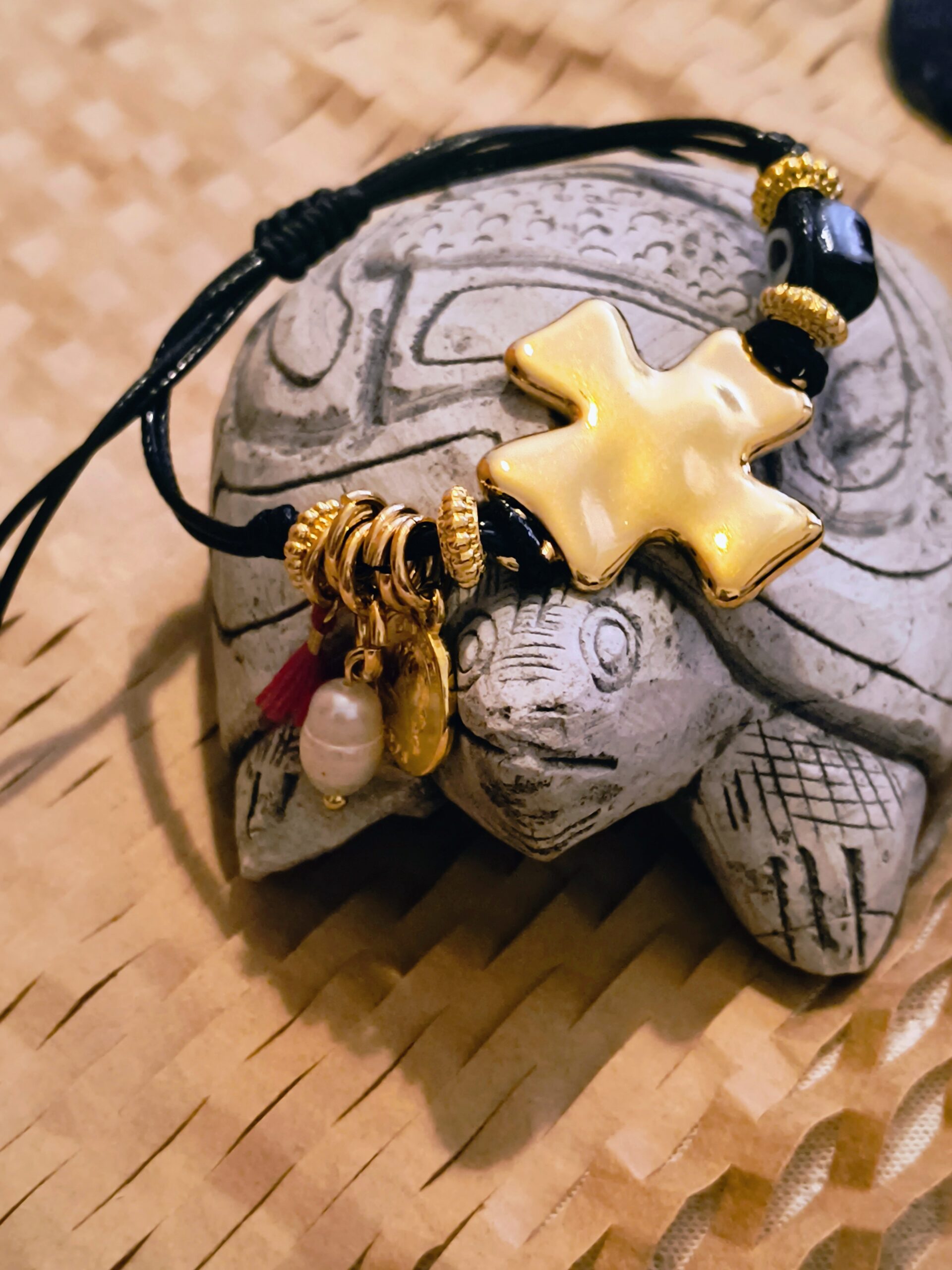 Ένα εκλεπτυσμένο βραχιόλι που συνδυάζει τη λάμψη του χρυσού με το μυστήριο του μαύρου. Φτιαγμένο από επίχρυσους μεταλλικούς συνδέσμους, χάντρες γυαλιού και μαύρο νάιλον κορδόνι, δένει μοναδικά στον καρπό με μακραμέ κλείσιμο για τέλεια εφαρμογή. Ιδανικό για boho αλλά και κομψές εμφανίσεις, φοριέται μόνο του ή σε layering με άλλα βραχιόλια για μια πιο μοντέρνα διάθεση. Ένα κόσμημα που συνδυάζει διακριτική πολυτέλεια με καθημερινή άνεση.