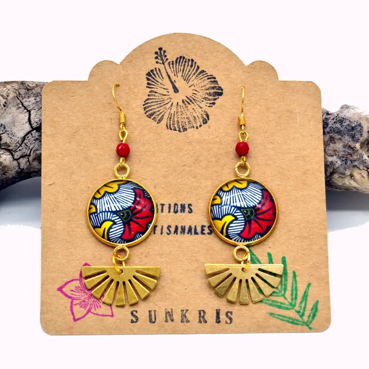 Εντυπωσιακά ethnic σκουλαρίκια με African wax μοτίβο και γυάλινο καμπουσόν. Ένα μοναδικό, χειροποίητο κόσμημα που δίνει ένταση και στυλ σε κάθε εμφάνιση.