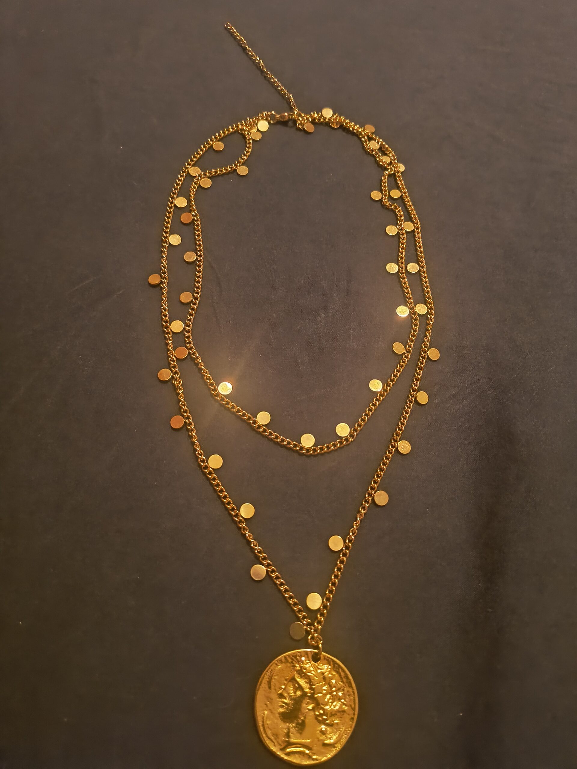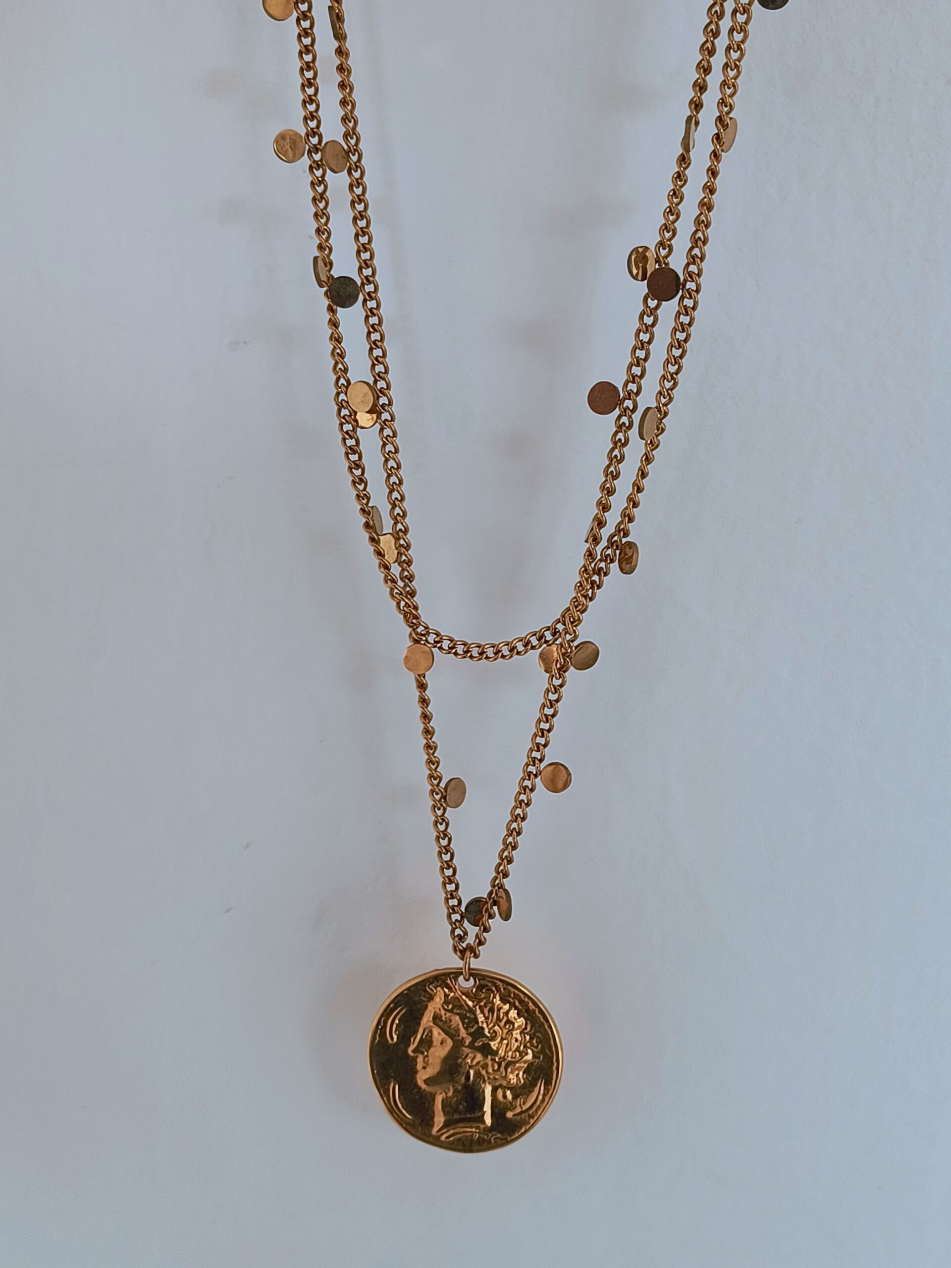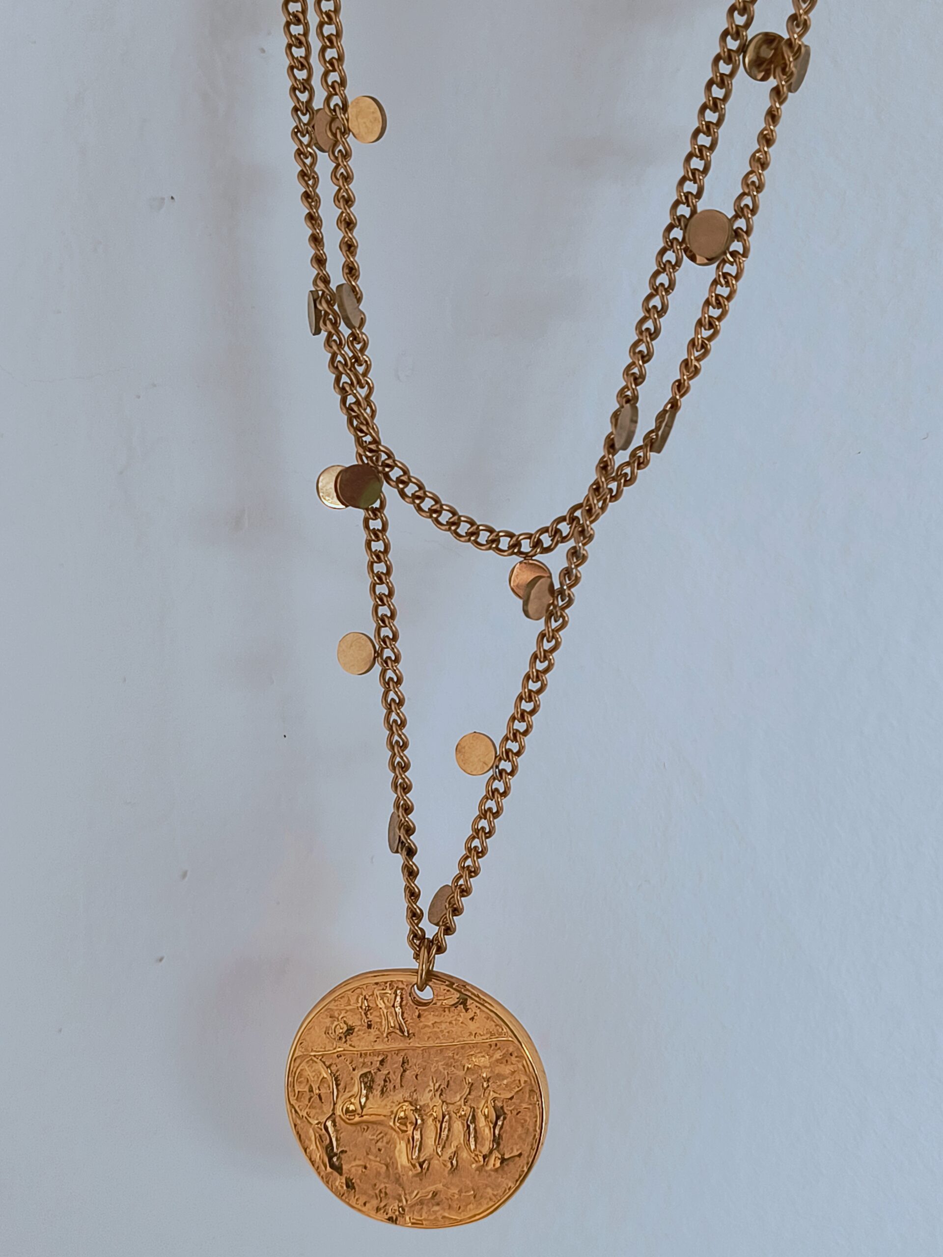 Δύο αλυσίδες από ανθεκτικό ατσάλι (43εκ & 50εκ) αγκαλιάζουν αρμονικά το λαιμό, στολίζονται με επιχρυσωμένα στοιχεία ορείχαλκου σε 24Κ χρυσό και αναδεικνύουν το εντυπωσιακό μενταγιόν-νόμισμα.
